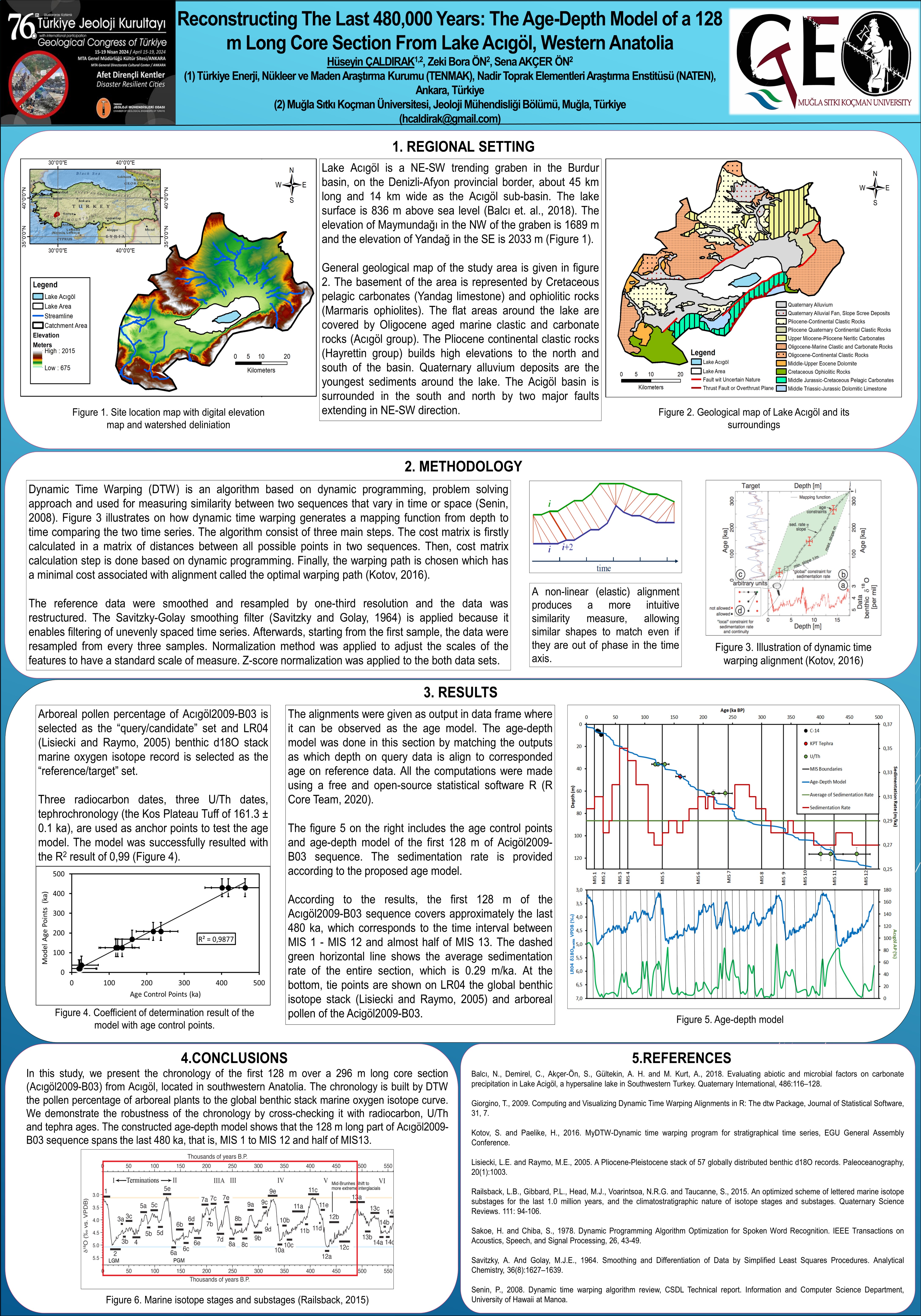 Bu çalışmada, Güneybatı Anadolu'daki "Göller Bölgesi "nde yer alan Acıgöl playa gölünden alınan 600 metre uzunluğundaki bir karotun (Acıgöl2009-B03) üst 128 metresi için bir derinlik-yaş modeli sunulmaktadır. Bu araştırmanın amacı, güneybatı Anadolu bölgesinde Kuvaterner döneminden günümüze iklim ve çevresel değişiklikleri anlamak için karotun jeokimyasal, mikropaleontolojik ve fiziksel özelliklerindeki değişiklikleri belirlemektir.